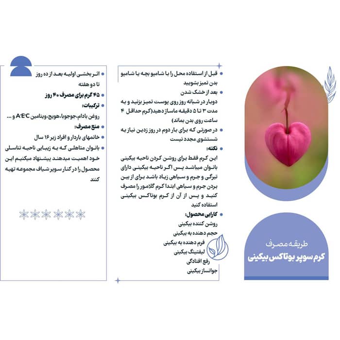 این کرم فقط برای روشن کردن ناحیه بیکینی بانوان میباشد پس اگر ناحیه بیکینی دارای تیرگی و جرم و سیاهی زیاد باشد برای از بین بردن جرم و سیاهی ابتدا کرم گلامور را مصرف کنید و پس از آن از کرم بوتاکس بیکینی استفاده کنید